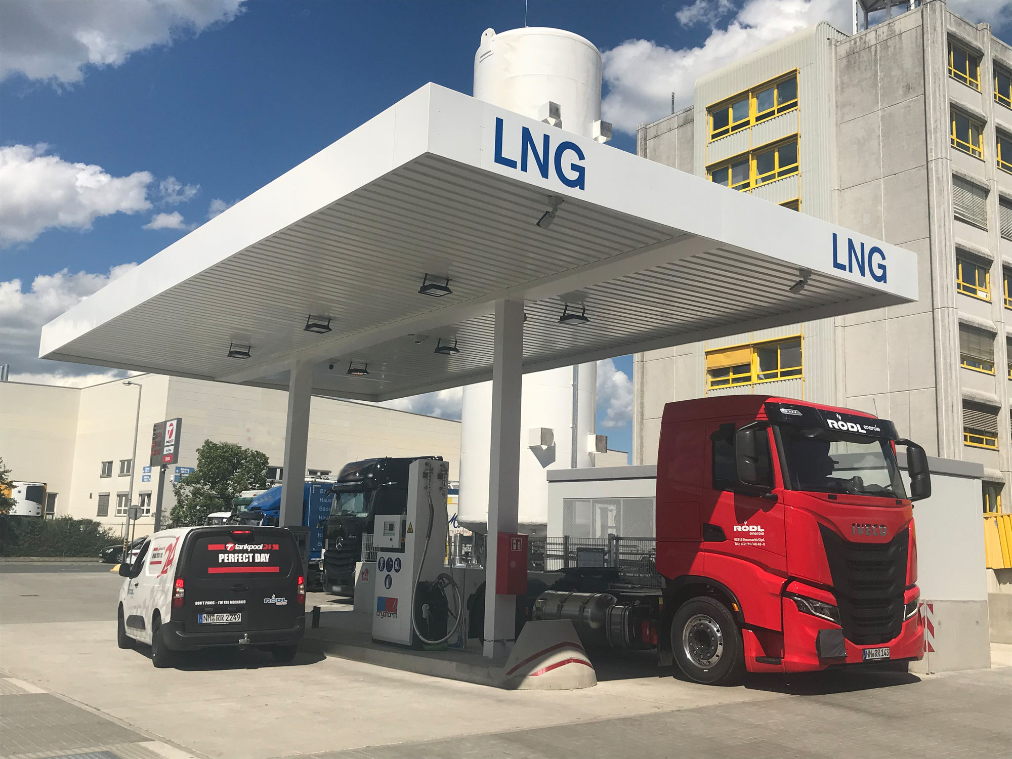 „Mit LNG setzen wir ein Zeichen in Richtung Zukunft. Als Unternehmer gehe ich von dem aus, was ich jetzt schon tun kann, nicht erst in fünf Jahren. Wer es heute mit Klimaschutz und CO2-Einsparung ernst meint, muss jetzt in LNG investieren, ohne dabei die zukünftige Entwicklung aus den Augen zu verlieren“, erläutert Geschäftsführer Stefan Rödl seine Beweggründe für die Investition in LNG. Neben dem Standort am Nürnberger Hafen plant er bereits zwei weitere LNG-Tankstellen. Er sieht in diesem Kraftstoff aktuell das größte Potential für einen umweltfreundlicheren Schwerlastverkehr bis andere Technologien wie Wasserstoff und E-Fuels ausgereift sind.